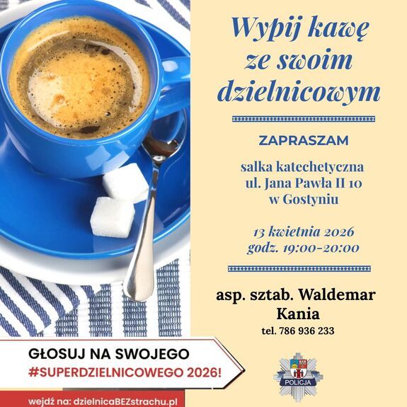 asp. szt. Waldemar Kania zaprasza mieszkańców rejonu służbowego nr 1 w Gostyniu na spotkanie przy kawie, które odbędzie się 13 kwietnia w godzinach od 19:00 do 20:00 w Salce Katechetycznej przy ul. Jana Pawła II w Gostyniu. Wydarzenie organizowane jest w ramach plebiscytu #SuperDzielnicowy2026. Zachęcamy do udziału w spotkaniu oraz do oddania głosu na swojego dzielnicowego.