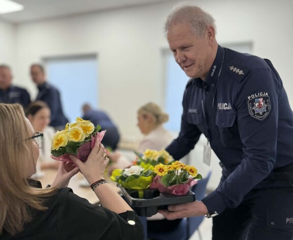 I Zastępca Komendanta Powiatowego Policji w Gostyniu podinsp. Zbigniew Krawczyk wraz z przewodniczącym policyjnych związków zawodowych podziękował paniom pracującym w jednostce za ich codzienny trud i profesjonalizm. Uroczyste spotkanie odbyło się w Sali odpraw i szkoleń gostyńskiej jednostki policji.