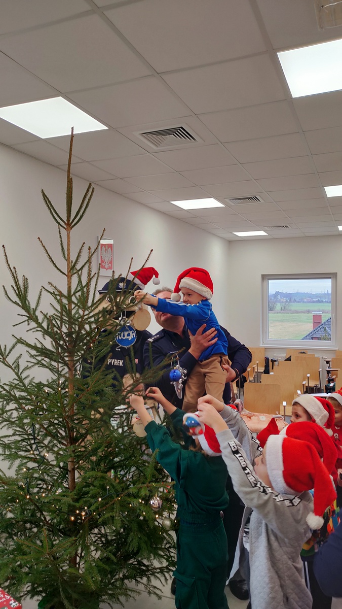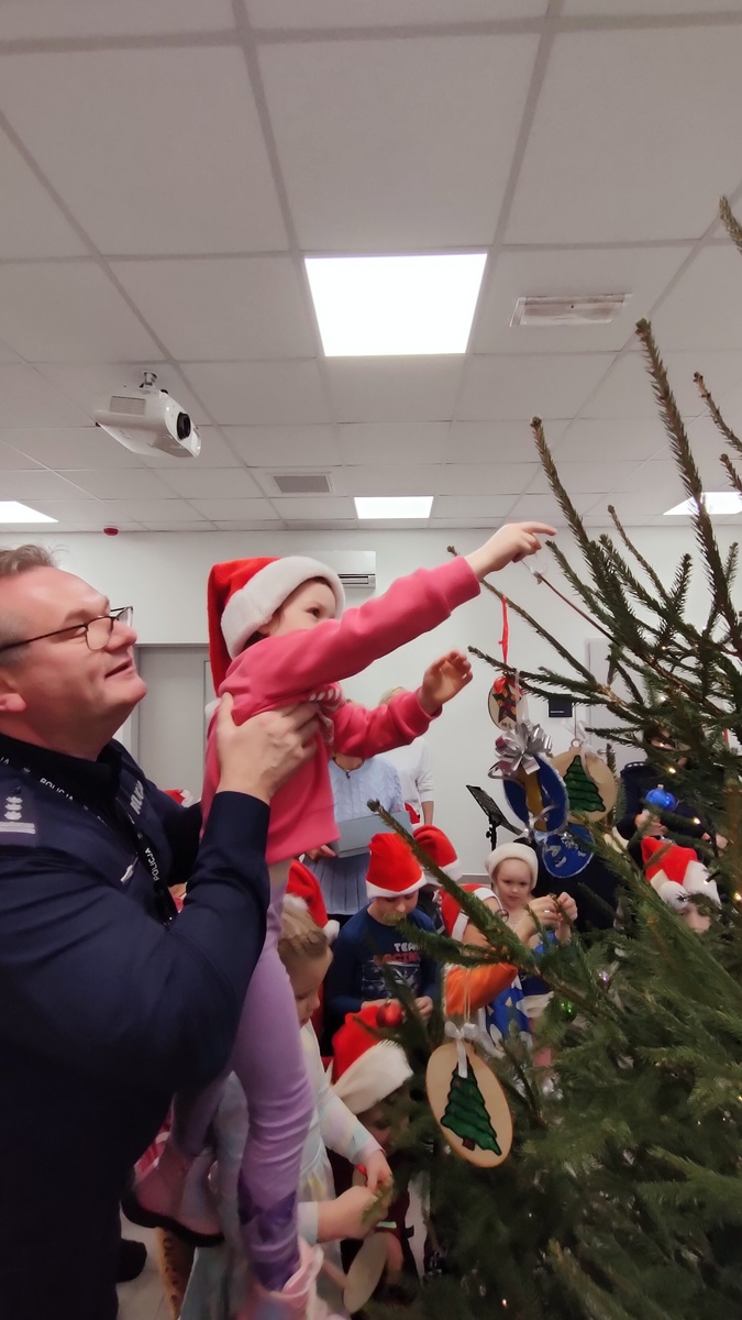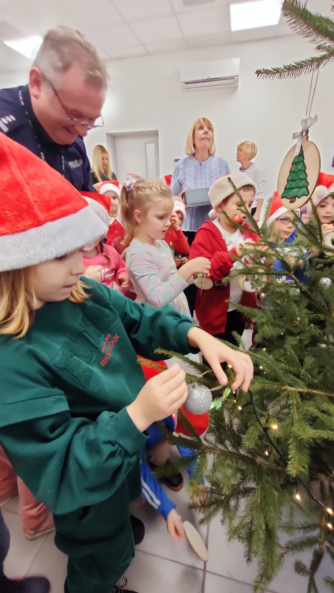 Dzieci z „Jedyneczki” przygotowały dla naszego drzewka własnoręcznie wykonane bombki i ozdoby świąteczne. Jako pierwszy symbolicznie bombkę na choince zawiesił obecny oczywiście na miejscu Sierżant Pyrek a następnie insp. Paweł Wawrzyniak.