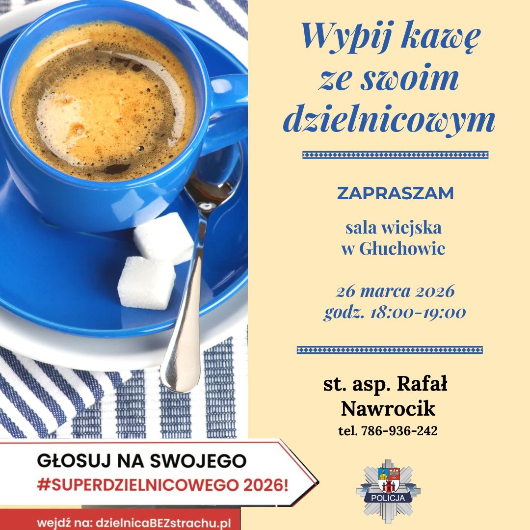St. asp. Rafał Nawrocik zaprasza mieszkańców Głuchowa i gminy Pogorzela na spotkanie przy kawie. Wydarzenie organizowane jest w ramach plebiscytu #SuperDzielnicowy2026. Zachęcamy do udziału w spotkaniu oraz do oddania głosu na swojego dzielnicowego.