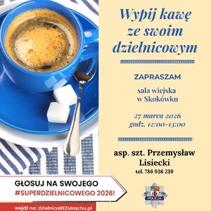 asp. szt. Przemysław Lisiecki zaprasza mieszkańców Skokówka i okolic na spotkanie przy kawie. Wydarzenie organizowane jest w ramach plebiscytu #SuperDzielnicowy2026. Zachęcamy do udziału w spotkaniu oraz do oddania głosu na swojego dzielnicowego.