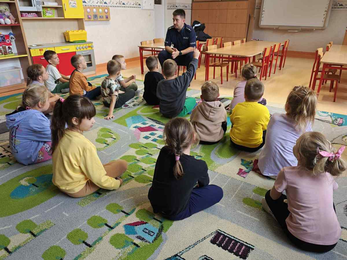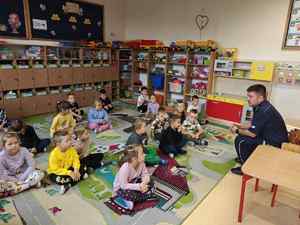 Podczas spotkania funkcjonariusz opowiadał o bezpiecznym zachowaniu na drodze, w domu oraz podczas kontaktów z osobami nieznajomymi. Dzieci dowiedziały się, jak ważne jest noszenie elementów odblaskowych, jak należy prawidłowo przechodzić przez jezdnię oraz w jakich sytuacjach można dzwonić na numer alarmowy 112.