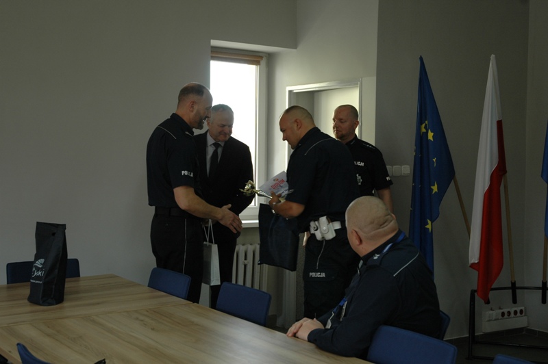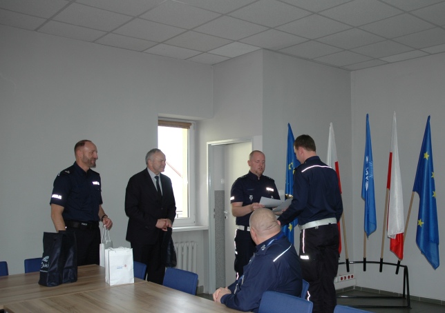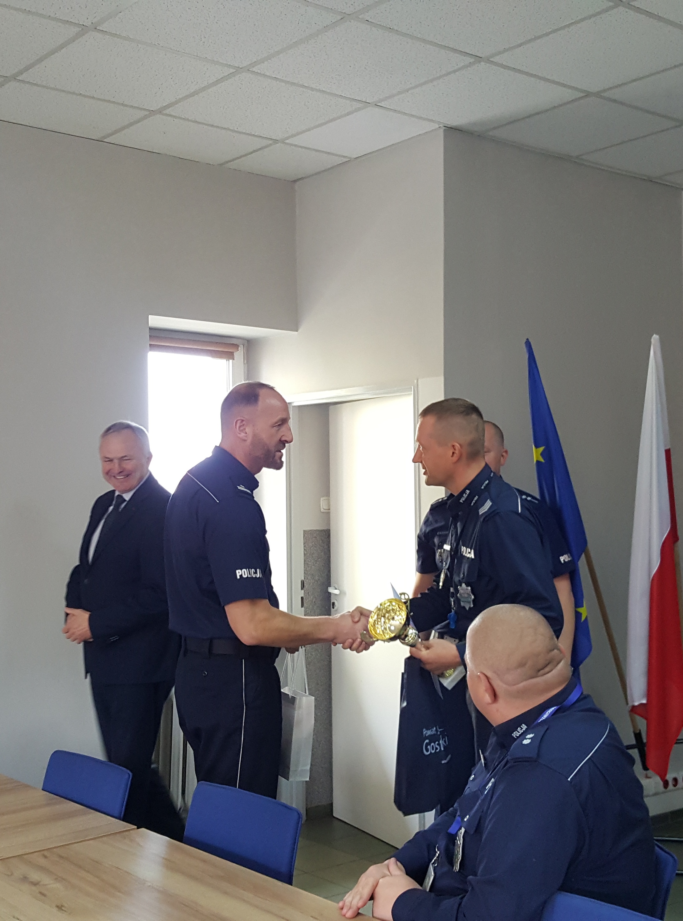 Komendant Powiatowy Policji w Gostyniu podinsp. Piotra Gorynia oraz Wicestarosta Gostyński Janusz Sikora wręczyli najlepszym policjantom puchary, dyplomy i pamiątkowe upominki propagujące powiat i gminę Gostyń.